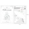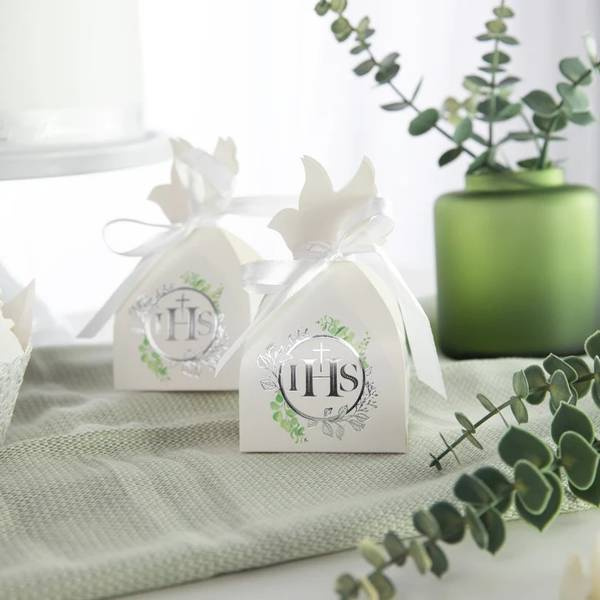 Pudełeczka wykonane z białego papieru ze srebrnym motywem hostii oraz nadrukiem listków eukaliptusa.