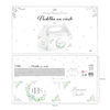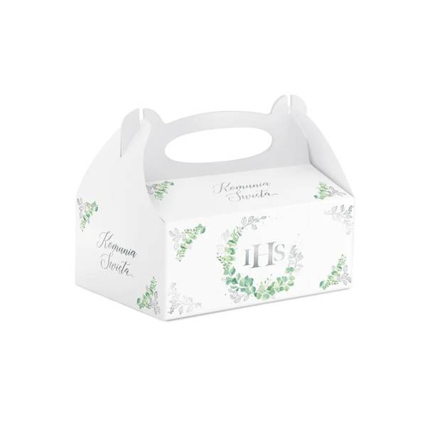 Białe ze srebrnymi napisami Komunia Święta i IHS oraz zielonymi i srebrnymi listki eukaliptusa.