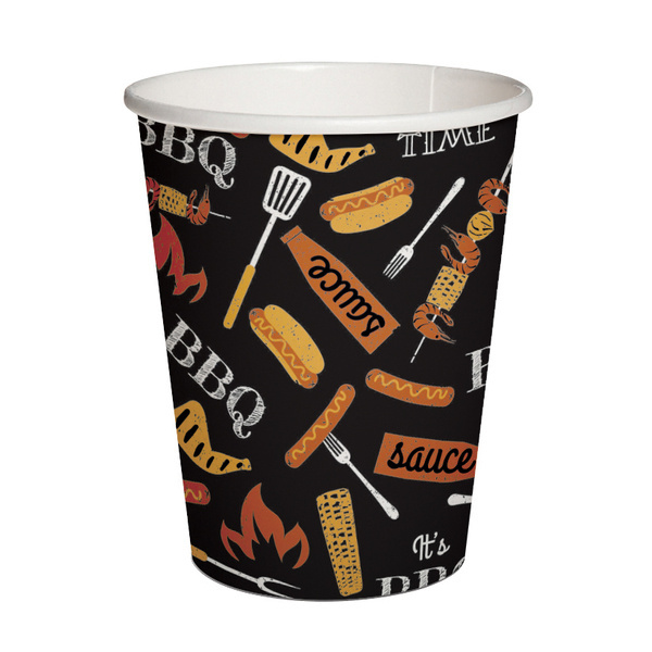 Kubeczki papierowe w kolorze czarnym z kolorowym nadrukiem.