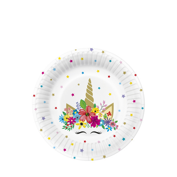 Zestaw 10 talerzyków papierowych z motywem jednorożca.