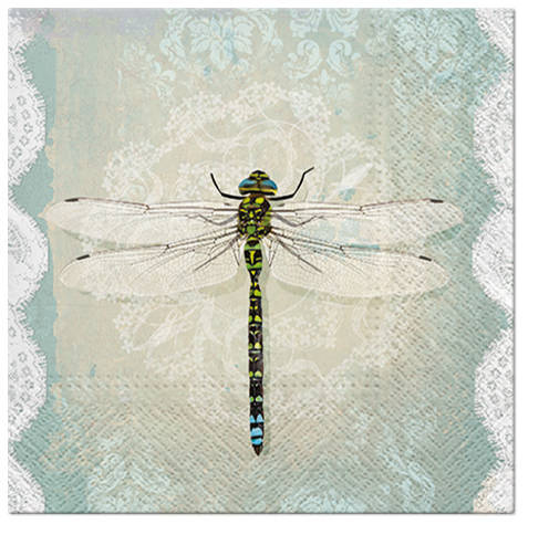 Z motywem ważki na zielonym tle oraz białym koronkowym obramowaniem.