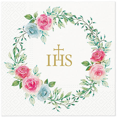 Ze złotym napisem IHS otoczonym zielonym wianuszkiem z kolorowymi różami.