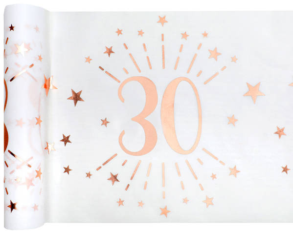 Nadruk w postaci liczby 30, gwiazdek i paseczków w kolorze różowego złota.
