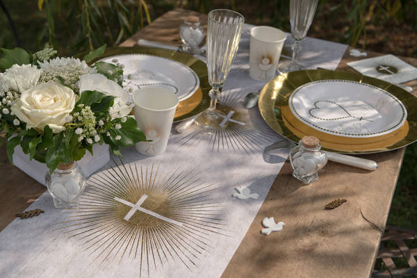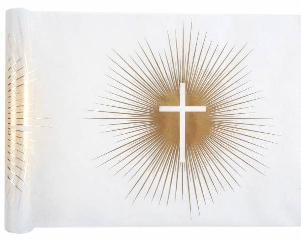 Złoty nadruk promieni odchodzących od krzyża.