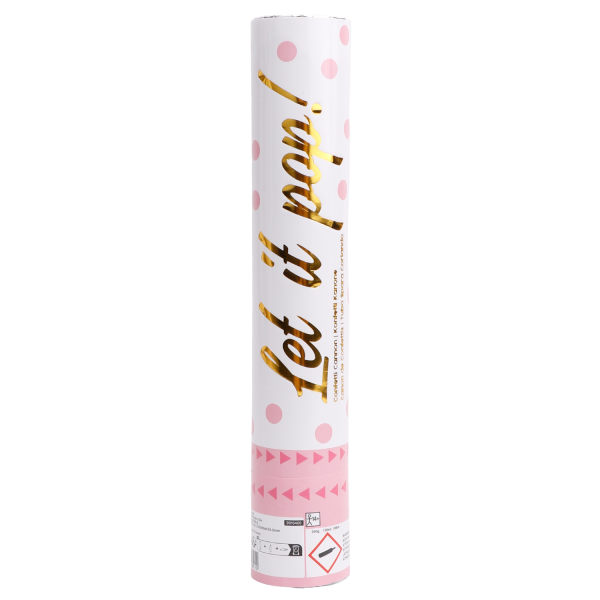 Tuba strzelająca papierowym konfetti w kształcie różowych kółek.