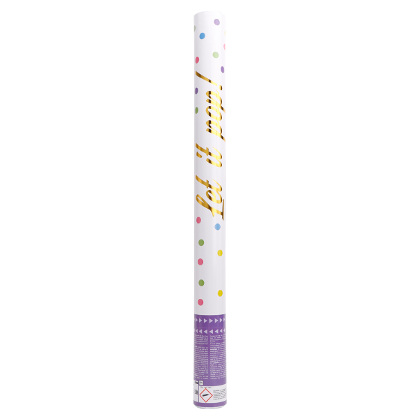 Tuba strzelająca papierowym konfetti w kształcie kolorowych kółek.