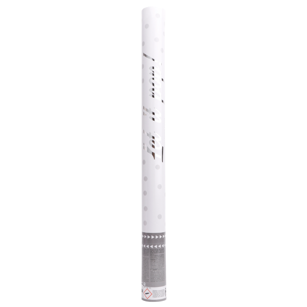 Tuba strzelająca papierowym konfetti w kształcie białych kółek.