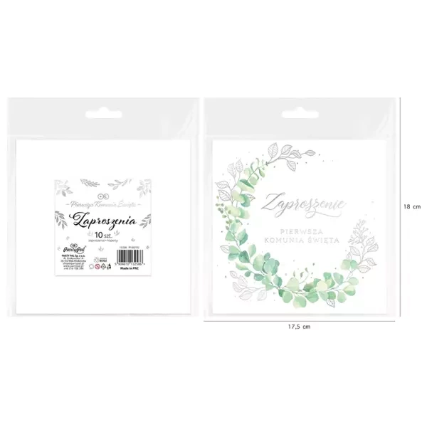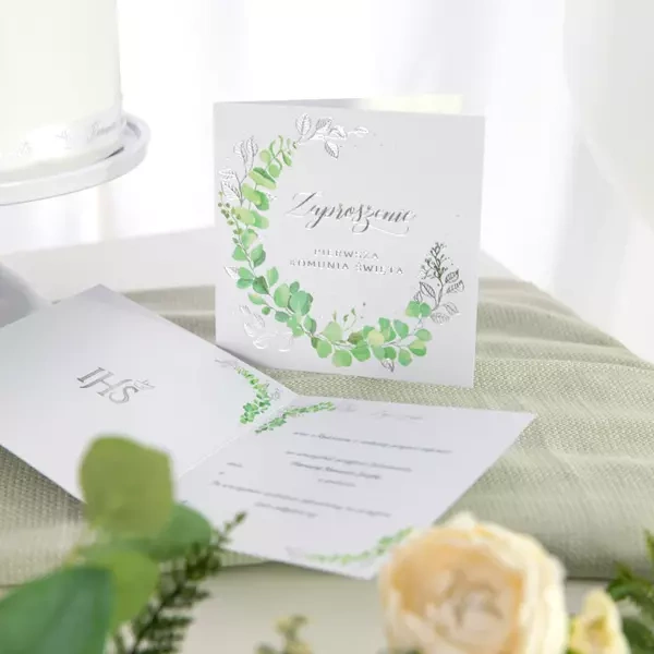 Z nadrukiem zielonych liści eukaliptusa i srebrnym napisem.