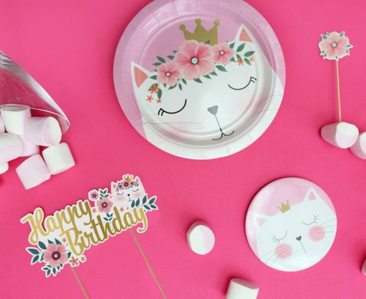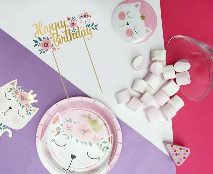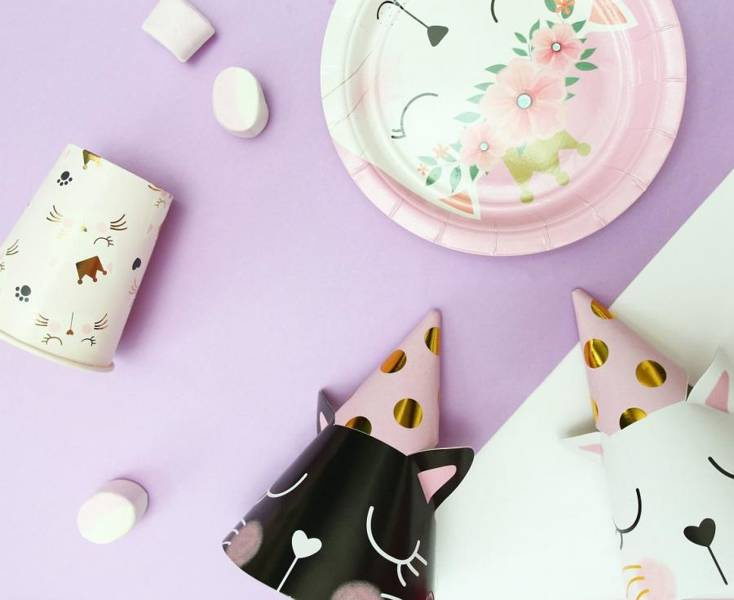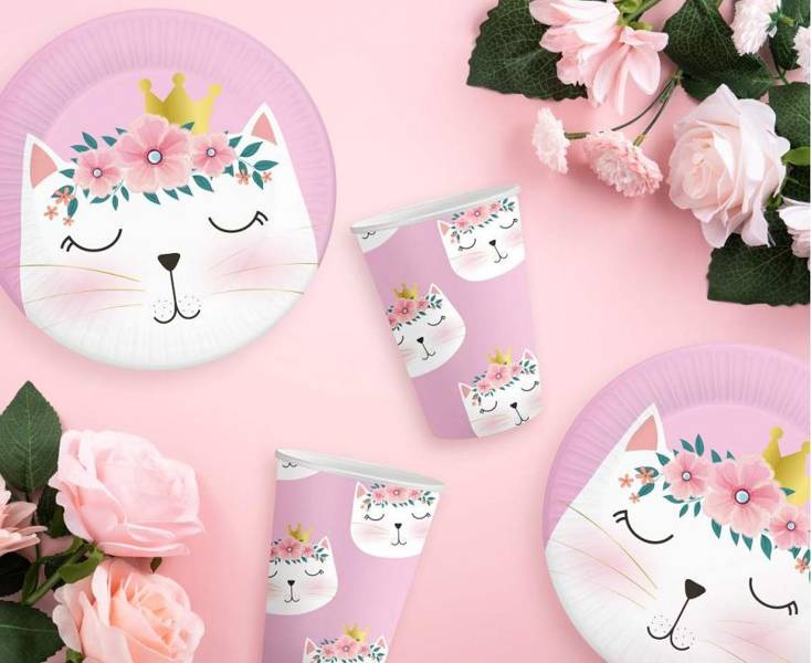 Zestaw talerzyków papierowych różowych z nadrukiem kotka.