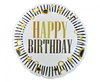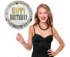 • Okrągły balon z nadrukiem "Happy Birthday" w kolorach bieli, czerni i złota.