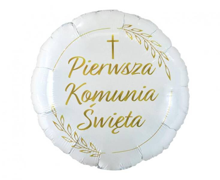 Zdobiony złotym napisem Pierwsza Komunia Święta oraz kłosami.