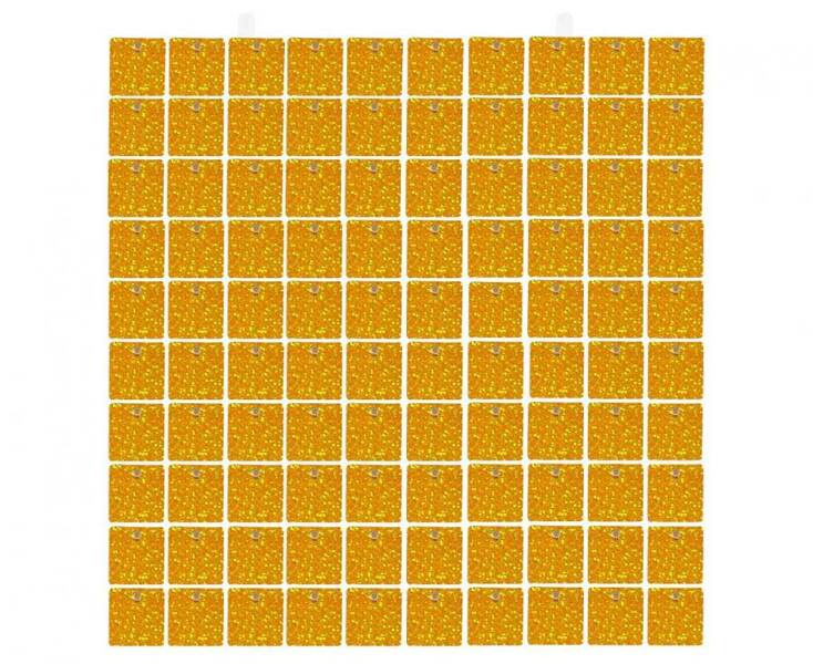 PANEL DEKORACYJNY HOLO ZŁOTY, 30x30cm Ilość: 1 szt. Ilość kwadratów: 100 szt. Kolor: holo złoty Kolor tła: przezroczysty Materiał:: plastik Panele posiadają specjalne zaczepy (coś w rodzaju zatrzasków) po każdej ze stron, umożliwiające łączenie ich ze sobą, co pozwala na stworzenie dużej, spójnej dekoracji.