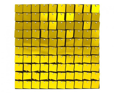 PANEL DEKORACYJNY ZŁOTY, 30x30cm Ilość: 1 szt. Ilość kwadratów: 100 szt. Kolor: złoty Kolor tła: czarny Materiał:: plastik Panele z czarnym tłem w odróżnieniu od paneli z tłem przezroczystym - nie posiadają specjalnych zaczepów, umożliwiających łączenie ich ze sobą. W zamian posiadają otwory (na bokach każdej ze stron) które umożliwiają połączenie z innymi panelami z pomocą żyłki/sznurka/trytytki lub przykręcenie ich za pomocą śrub/wkrętów do ściany/stelażu. Zestaw nie zawiera wymienionych wcześniej materiałów do łączenia z innymi panelami.