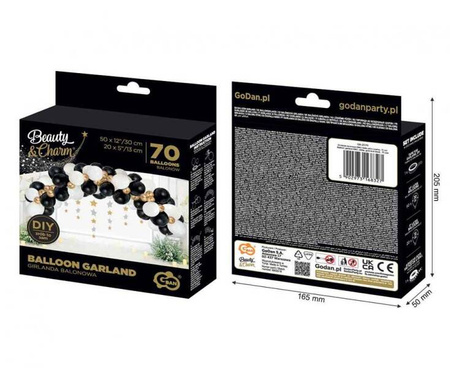 GIRLANDA BALONOWA BEAUTY&CHARM BIAŁO-ZŁOTO-CZARNA Rozmiar w calach: 50 szt. x 12 cali, 20 szt. x 5 cali Rozmiar w centymetrach: 50 x 30 cm, 20 x 12 cm Kolor: biały, złoty, czarny Opakowanie zawiera: 70 balonów, taśmę do girland, kropki klejowe na rolce 100 szt. Opakowanie nie zawiera łańcucha z gwiazdkami Kolekcja/Linia: Beauty&Charm Producent: Godan S.A. Girlanda balonowa w kolorze białym, złotym i czarnym z kolekcji Beauty&Charm. Stwórz zjawiskową kompozycję z balonów i przygotuj szampańską dekorację na urodziny, wesele, wieczór panieński, sylwestra i wiele innych okazji! Girlandę tworzą najwyższej jakości balony.