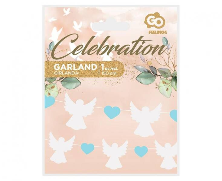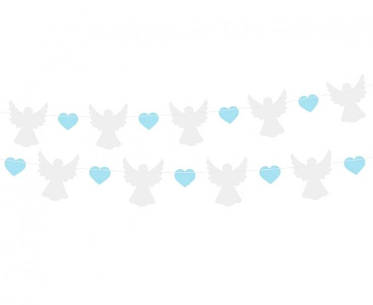 Girlanda papierowa z białymi aniołami i niebieskimi serduszkami.