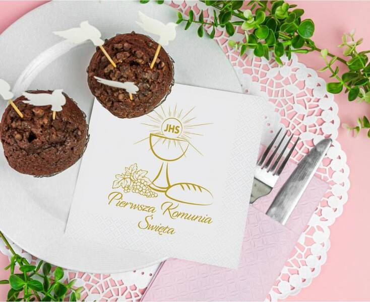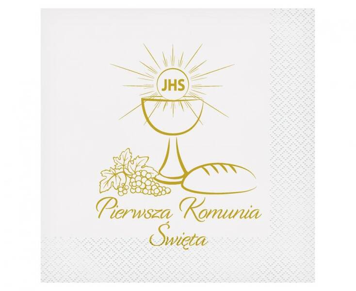 Zdobione złotym napisem Pierwsza Komunia Święta oraz nawiązującym do tego święta nadrukiem.