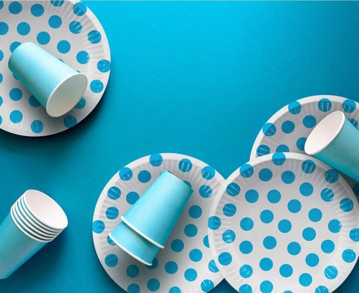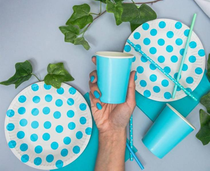 Talerzyki papierowe w kolorze białym, ozdobione niebieskimi groszkami.