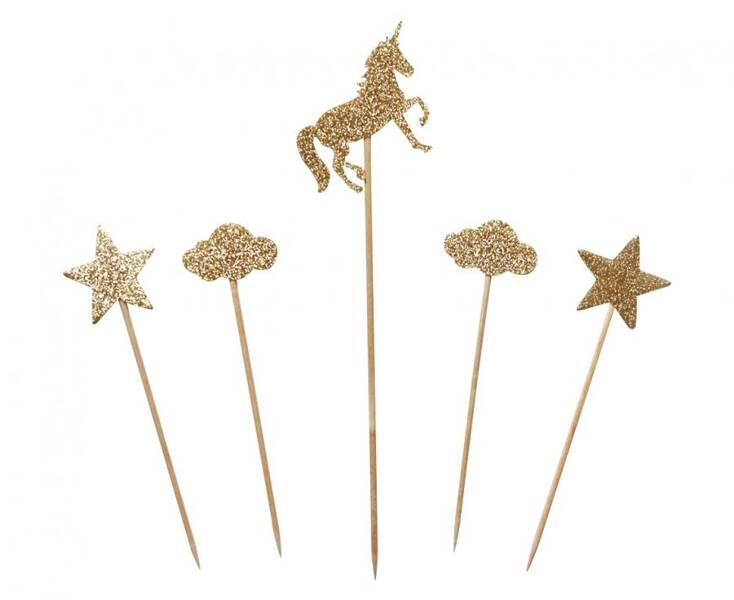 PIKERY DO BABECZEK (MUFFINEK) JEDNOROŻEC Wymiary: 4 x 10 cm, 1 x 15 cm Kolor: Złoty brokat W opakowaniu: 5 elementów Wzór: Jednorożec Producent: Godan S.A.