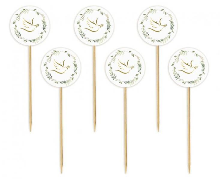 Produkt w kolorze białym, zdobiony złotym gołębiem oraz gałązkami eukaliptusa.