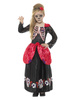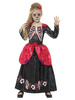 Długa sukienka w kolorze czarno-czerwonym. Ozdobiona brokatowymi nadrukami kości, czaszek i kwiatków.