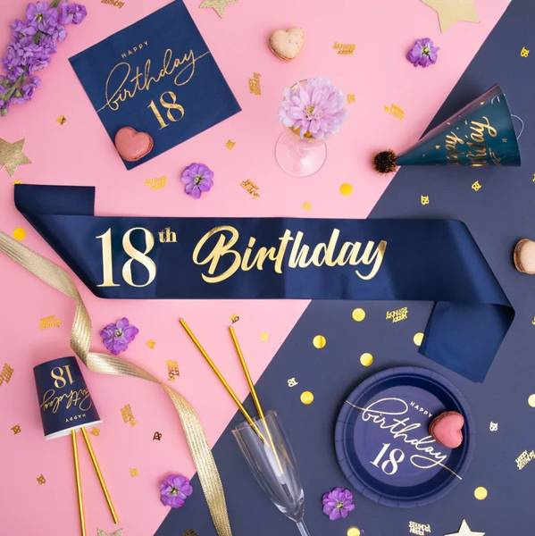 • Szarfa urodzinowa w kolorze granatowym ze złotym napisem 18th Birthday.