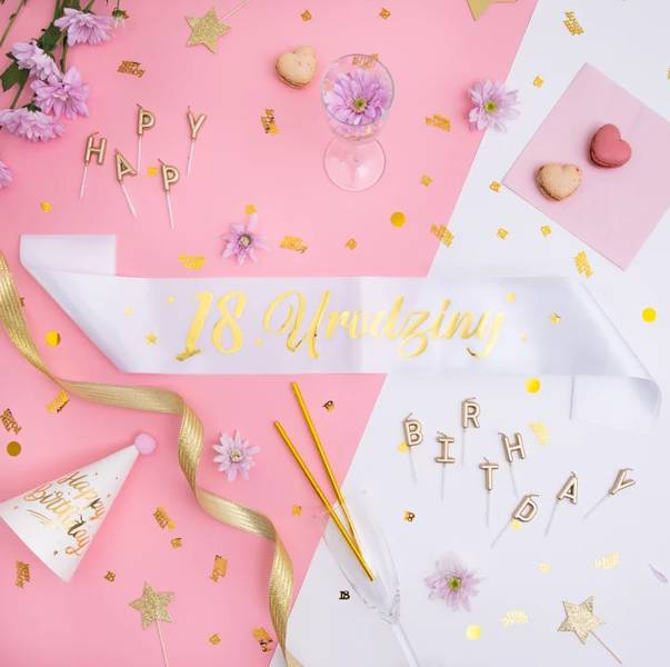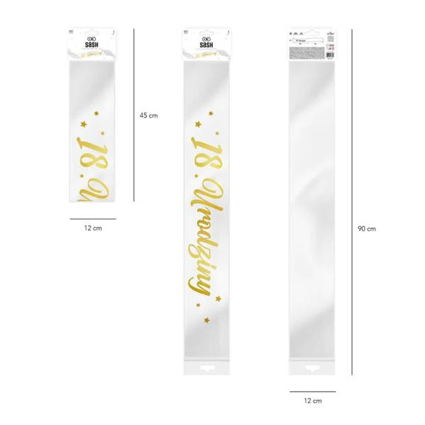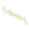 Szarfa urodzinowa w kolorze białym ze złotym napisem 18 Urodziny.