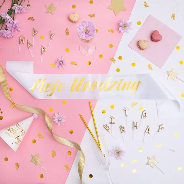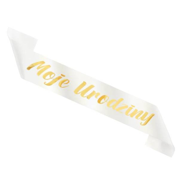 Szarfa urodzinowa w kolorze białym ze złotym napisem Moje Urodziny.