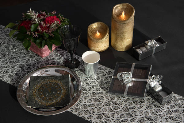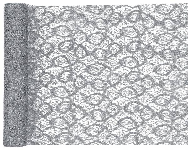 Bieżnik wykonany z koronki o metalicznym połysku.