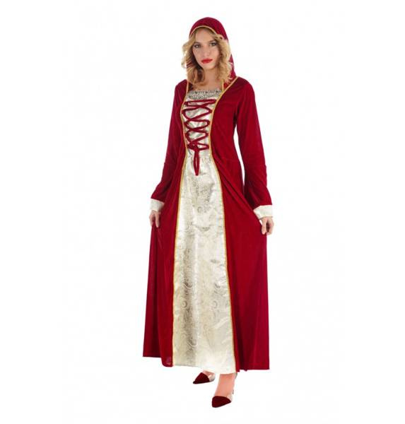 Suknia w kolorze bordowym z białymi wstawkami imitującymi koronkę.