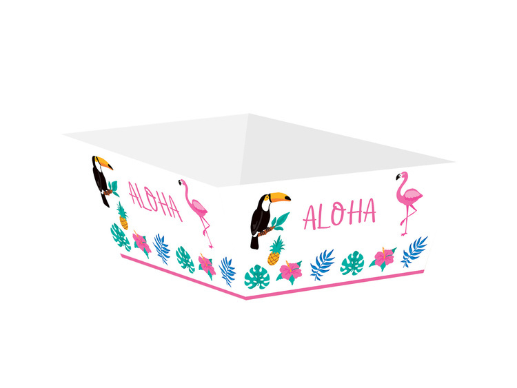 Zdobione napisem aloha, oraz tukanem i flamingiem.
