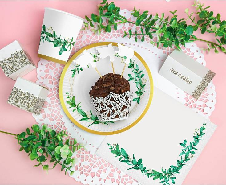Kubeczki papierowe w kolorze białym z nadrukiem zielonych listków.