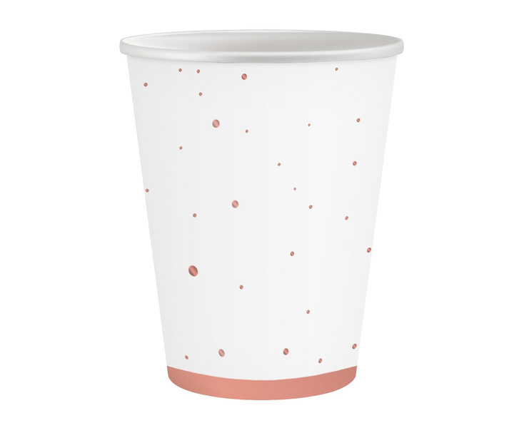 Kubeczki papierowe w kolorze białym z różowo-złotymi kropkami.