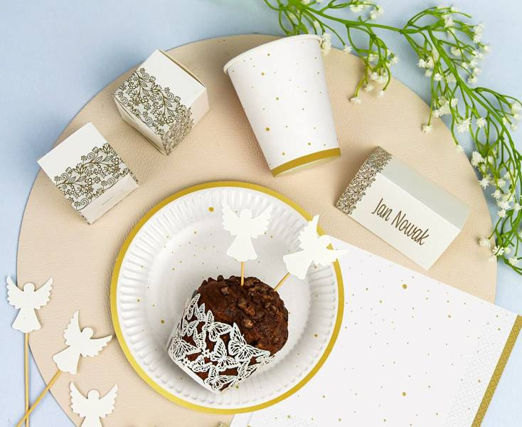 Kubeczki papierowe w kolorze białym ze złotymi kropkami.