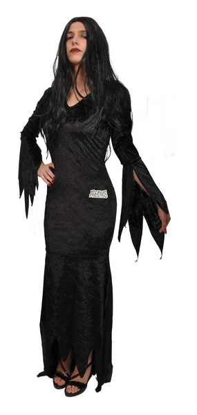 Suknia czarna z długim rękawem, wykonana z materiału imitującego welur.