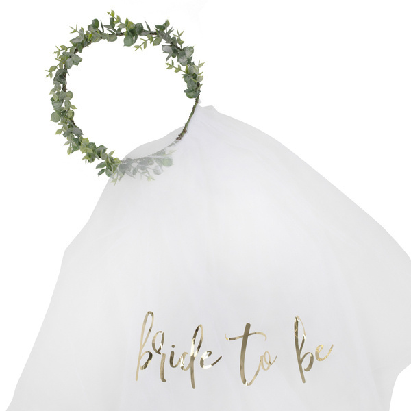 Wianek z zielonymi listkami eukaliptusa oraz białym welonem z napisem Bride to be.