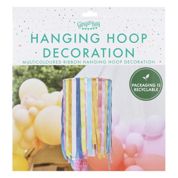 Dekoracja wisząca składająca się z obręczy o średnicy ok. 30 cm i 8 kolorowych wstążek.