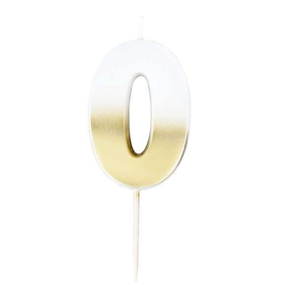 Świeczka w kształcie biało-złotej cyfry 0.