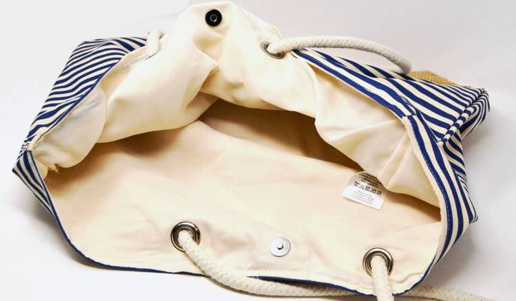 • Torba wykonana z materiału w granatowo-kremowe paski.