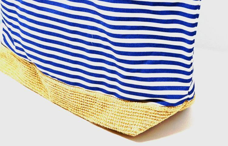 Torba wykonana z materiału w granatowo-kremowe paski.