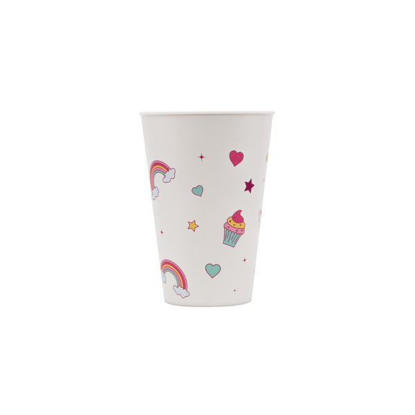 Kubeczek wielorazowy w kolorze białym, z nadrukiem tęczy oraz babeczek.