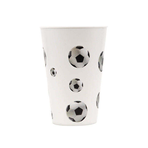 Kubeczek wielorazowy w kolorze białym, z nadrukiem piłek.