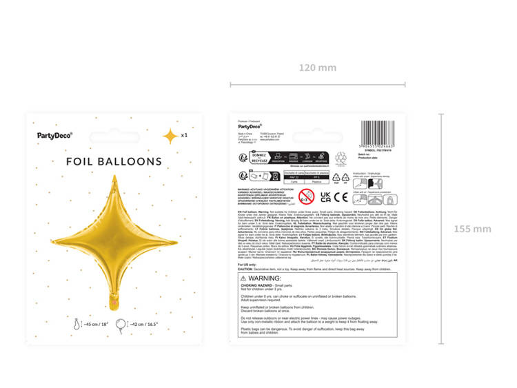 Balon foliowy w kształcie gwiazdy 4-ramiennej w kolorze złotym.