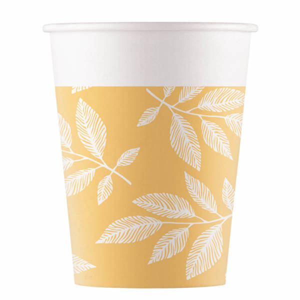 Kubeczki papierowe ze wzorem białych gałązek na pomarańczowym tle.
