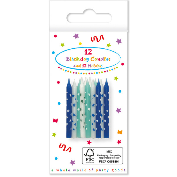 Zestaw 12 świeczek w odcieniach niebieskiego, ozdobione gwiazdkami.