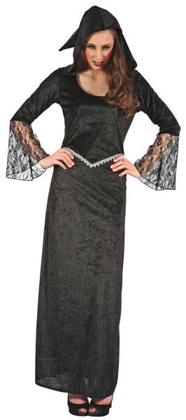 Suknia w kolorze czarnym, rękawy wykończone koronką.