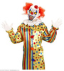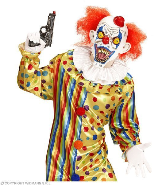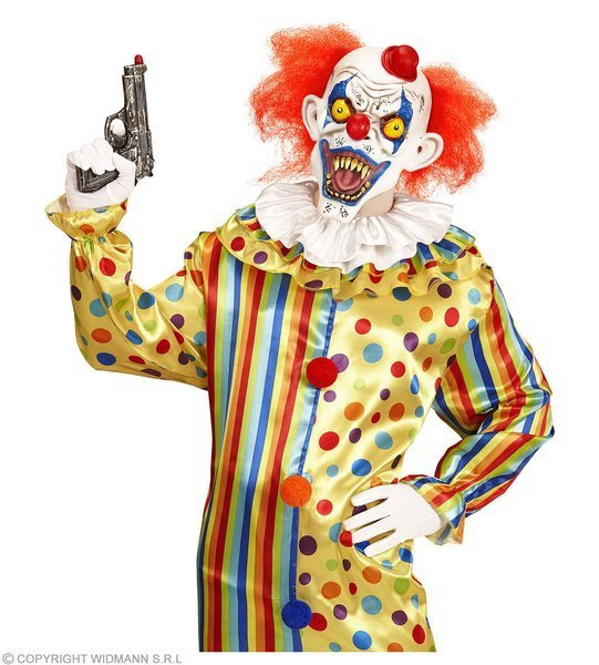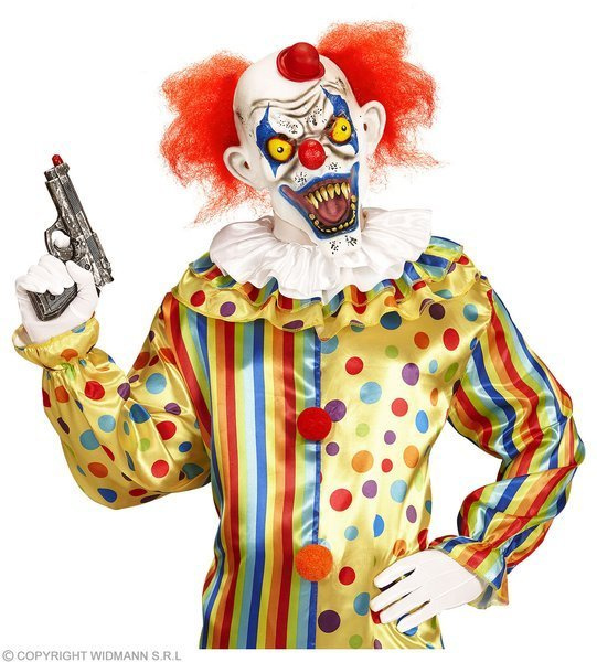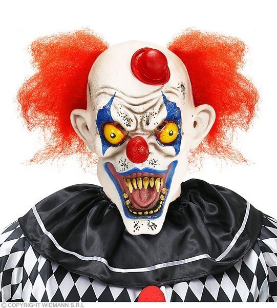 Maska przestawia pomarszczoną, przerażającą twarz klauna. Do boków maski doczepiono dwa koczki z czerwonych włosów.