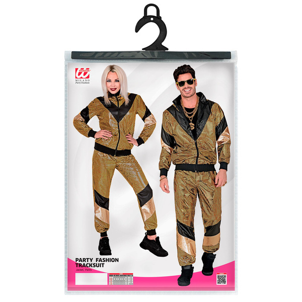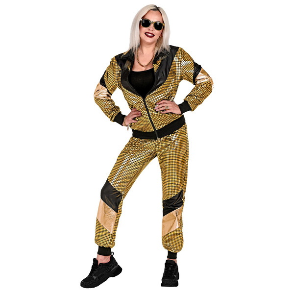 Strój w kolorze metalicznym złotym z czarnymi wstawkami i ściągaczami.