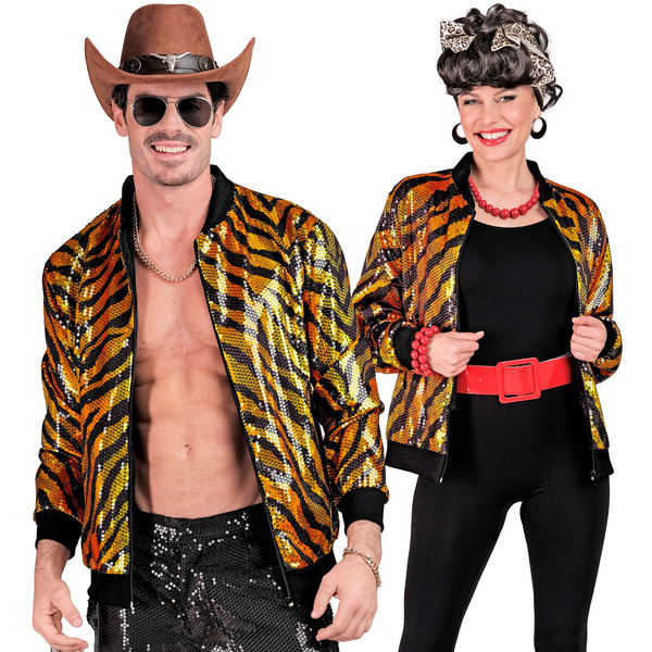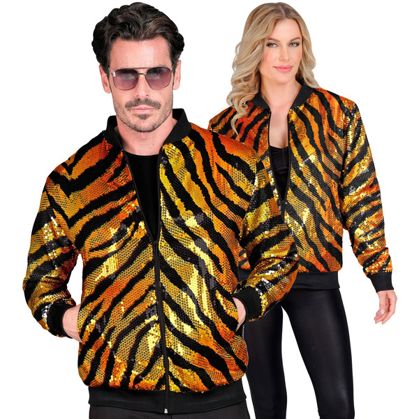Kurtka bomberka w cekiny. Kolor złoto- czarny. Motyw tygrys. Produkt unisex.
