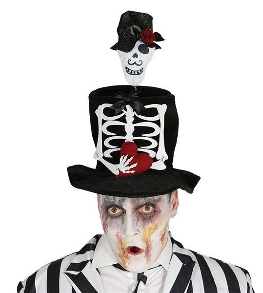 Do kapelusza dołączona głowa czaszki z kapeluszem ozdobionym czerwoną różą.