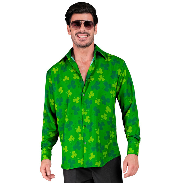 Koszula męska w kolorze zielonym, zdobiona koniczynami.